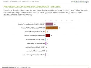 La casa encuestadora Buendía & Márquez colocó a José Ricardo Gallardo Cardona, candidato a la gubernatura por la coalición Juntos Haremos Historia, integrada por el PVEM y PT, con el 47 por ciento de las preferencias electorales, por lo que obtendría una victoria contundente.