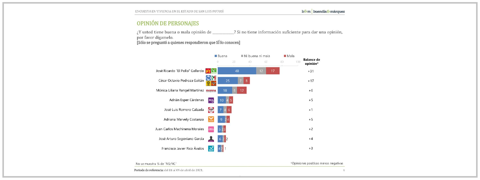 “Lo que hay es que ya tenemos grandes balances en cuestión de conocimiento, Ricardo Gallardo tiene un 48 por ciento de la opiniones positivas 12 neutrales y 17 negativas, eso te está hablando de un conocimiento muy superior al del siguiente candidato que es César Octavio Pedroza Gaitán que tiene 25 por ciento de opiniones positivas siete neutrales y ocho negativas”.
