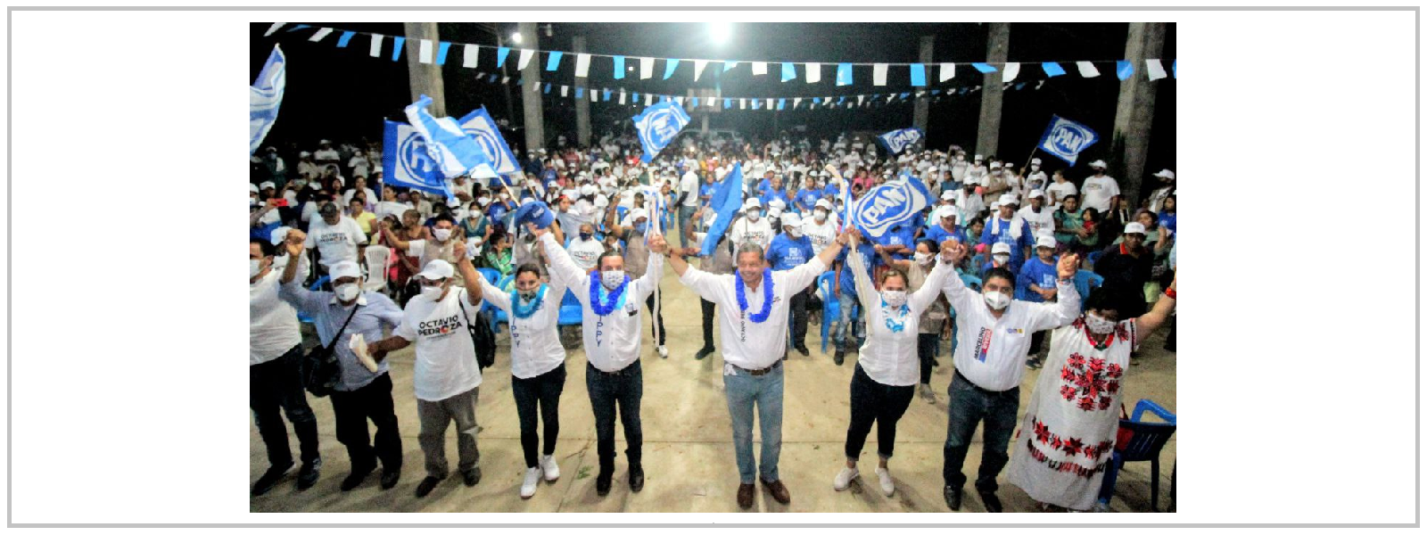 Aquí estuvo acompañado por los candidatos a la alcaldía de Tancanhuitz, Limbania Martell Espinoza y Manuel Aguilar Acuña; de Marcelino Rivera Hernández, candidato a la diputación federal del Distrito VII; de Yolanda Josefina Cepeda Echavarría, candidata a diputada local por el Distrito XIV; por los candidatos a diputaciones locales de representación proporcional, Verónica Rodríguez Hernández y Alejandro Leal Tovías; del presidente del Partido Conciencia Popular, Óscar Carlos Vera Fábregat y de Xavier Azuara Zúñiga, candidato a diputado federal de representación proporcional.