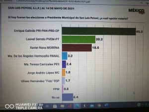 Por su parte, la organización México Elige realizó una encuesta con la pregunta «Si hoy fuera la elección para presidente municipal de SLP ¿Por quién votaría?» y obtuvo los siguientes resultados: 45.3% de los encuestados respondió afirmativamente por Enrique Galindo, candidato de la Coalición Sí por San Luis; el 20.2% optó por Leonel Serrato, del la Coalición PVEM-PT; mientras que el 18% respondió que por Xavier Nava Palacios, candidato por Morena.