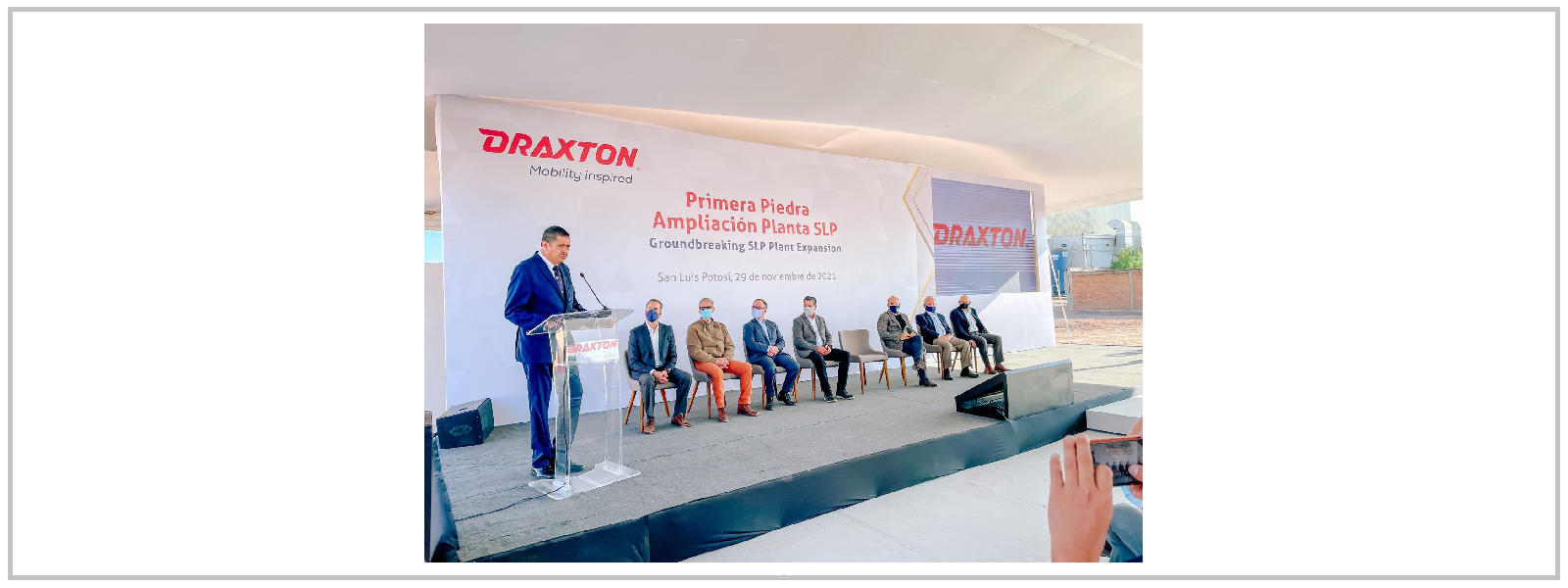 Como resultado de la política de fomento a la inversión privada que impulsa el Gobernador del Estado de San Luis Potosí Ricardo Gallardo Cardona, se llevó a cabo la ceremonia de colocación de la primera piedra de expansión de la empresa DRAXTON, en la cual se invertirán 30 millones de dólares y se generarán 110 nuevos empleos para las potosinas y los potosinos.