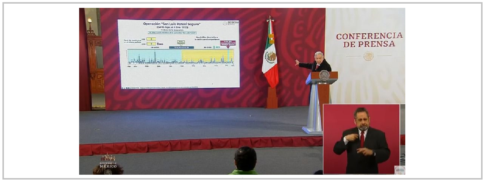 “Estamos ayudando en todos los Estados, lo vamos a seguir haciendo. Es muy claro que en el tema de seguridad actuamos de manera coordinada los gobiernos estatales, el Gobierno federal, esto tiene que atenderse de manera responsable, no debe de prevalecer el interés partidista o político, y San Luis Potosí tiene apoyo del Gobierno federal y lo va a seguir teniendo”, sentenció López Obrador. Además presentó datos sobre seguridad en el Estado: “la secretaria de Seguridad Pública es de San Luis Potosí, entonces le vamos a pedir que informe hoy sobre San Luis Potosí”.
