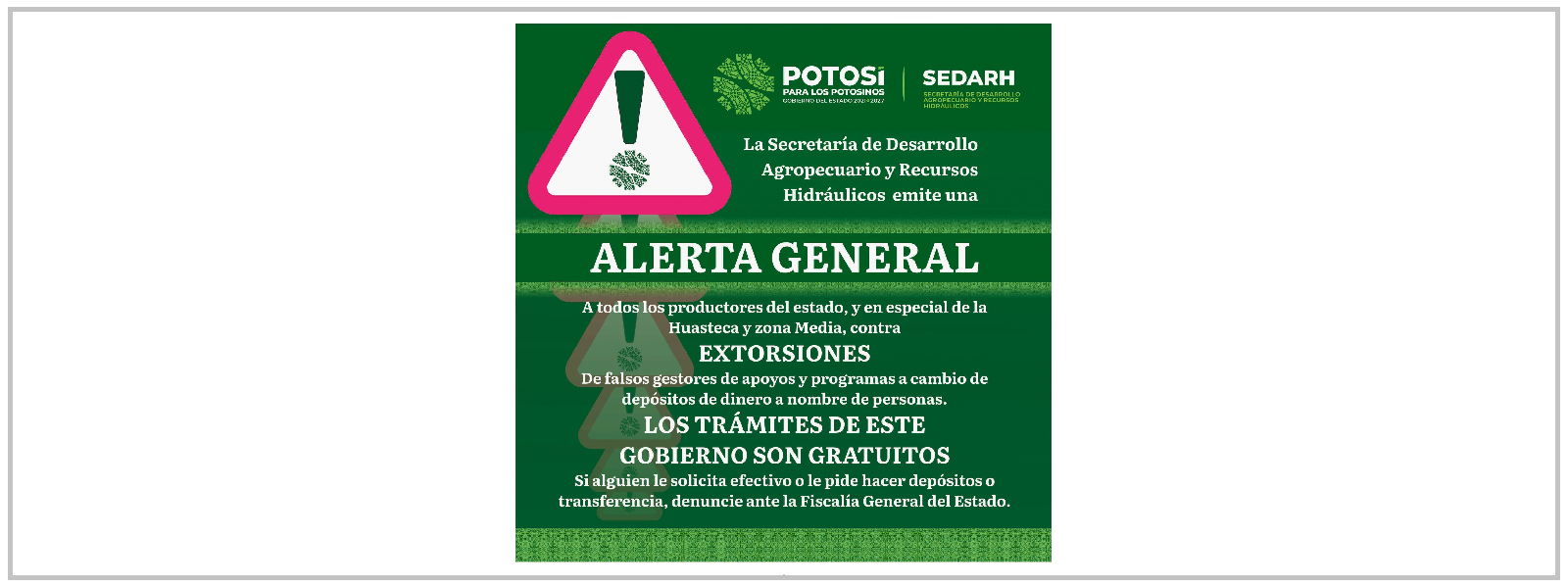 La Secretaría de Desarrollo Agropecuario y Recursos Hidráulicos (Sedarh), emitió una alerta general a las y los productores del campo, para evitar fraudes, ya que se han detectado falsos gestores que ayudados de perfiles de Facebook, WhatsApp, mensajes y llamadas, solicitan dinero a cambio de equipo, tractores, apoyos económicos o en especies animales, por lo que hizo un llamado a extremar precauciones, pues el Gobierno del cambio que dirige Ricardo Gallardo Cardona, no cobra por los trámites.
