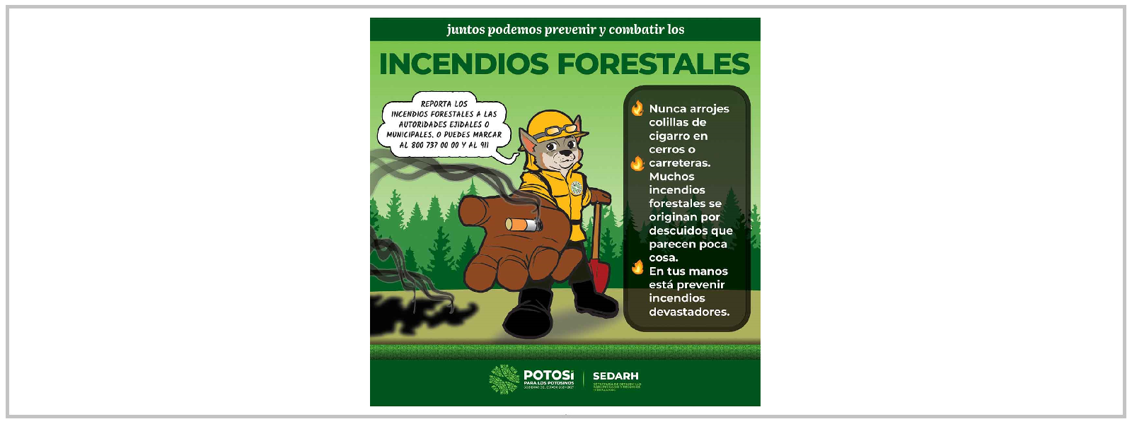 El titular de la Sedarh reveló que en una primera etapa, con la imagen de un zorro, se le pide a las personas evitar el uso de fogatas en áreas verdes, no tirar colillas de cigarro en cerros o carreteras, no usar pirotecnia ni globos de cantoya y evitar las quemas agrícolas, o en caso necesario, solicitar apoyo a las autoridades ambientales y asesoría para evitar daños.