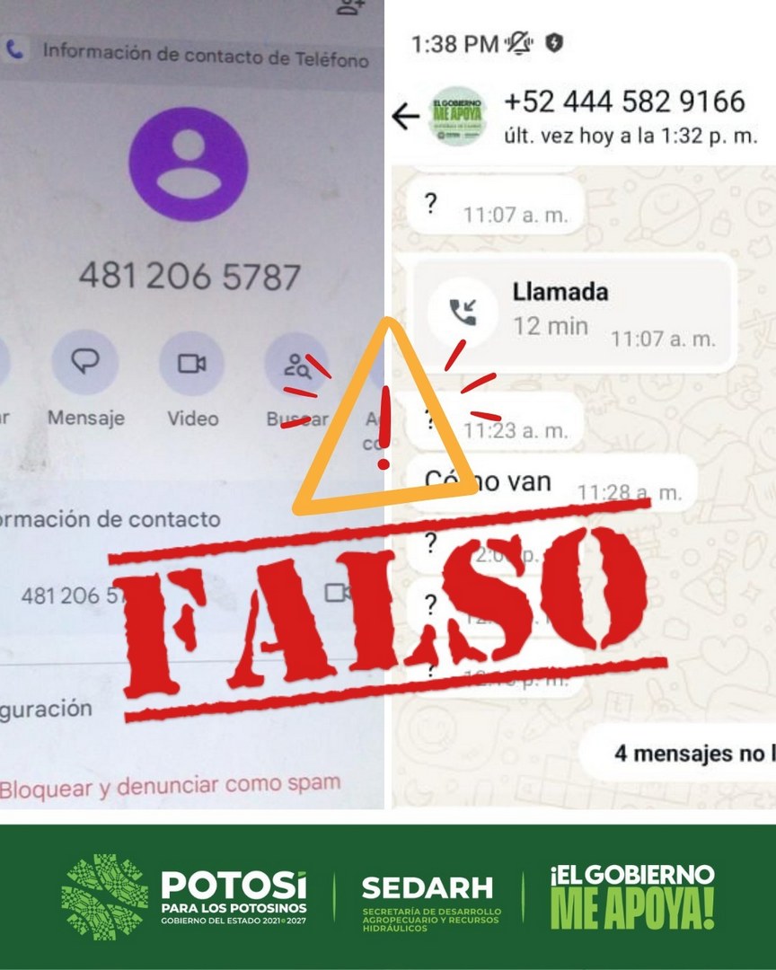 Detalló que los números de celular 481 206 5787 y 444 582 9166 son utilizados, para llamar o enviar mensajes de texto y de WhatsApp, y ofrecer apoyos para producción del campo, por medio de un pago, lo cual es mentira.