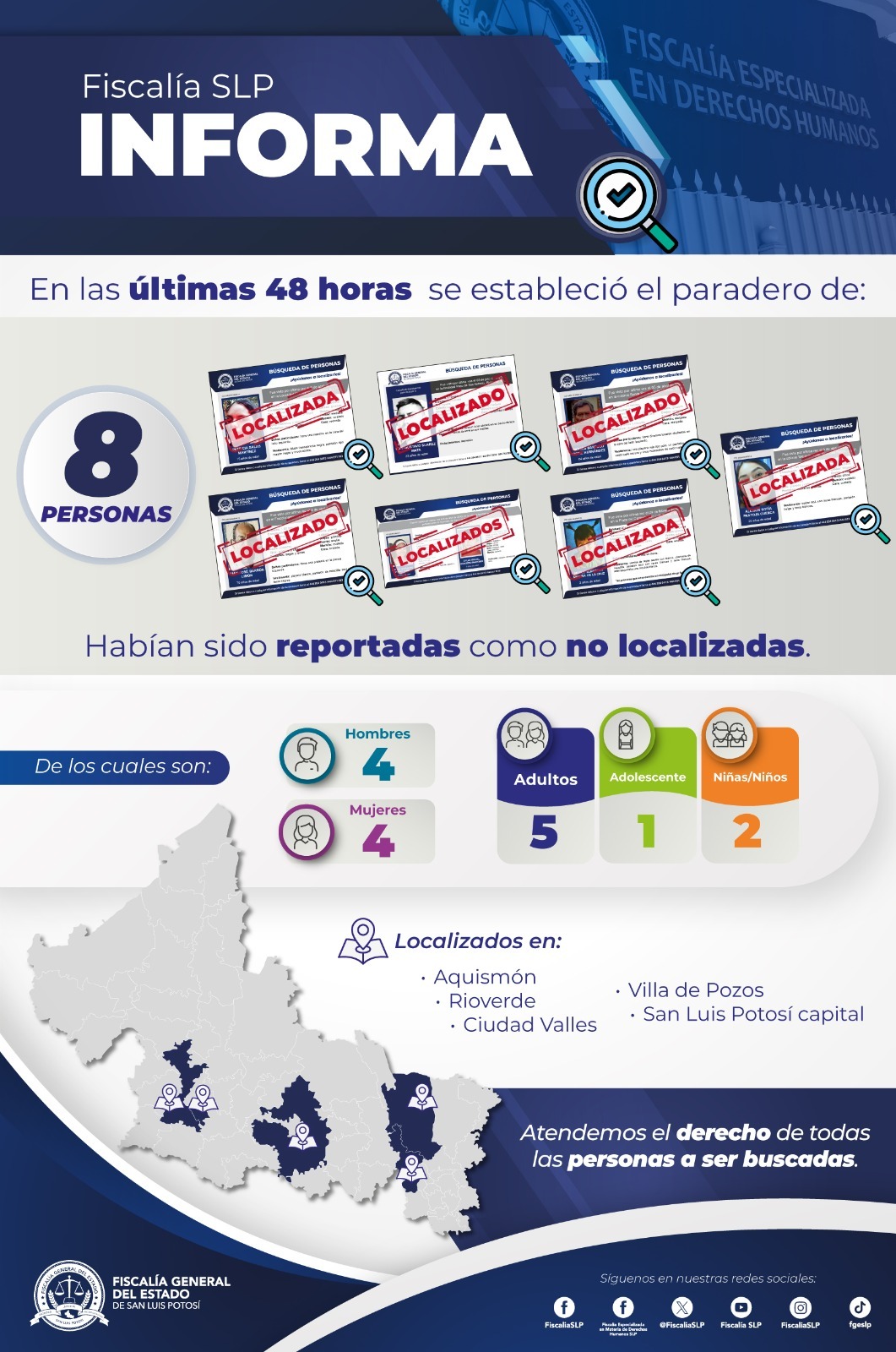 La Fiscalía General del Estado de San Luis Potosí (FGESLP), en las últimas 48 horas, estableció el paradero de ocho personas que habían sido reportadas como no localizadas en la entidad, garantizando su reintegración a sus respectivos núcleos familiares.
